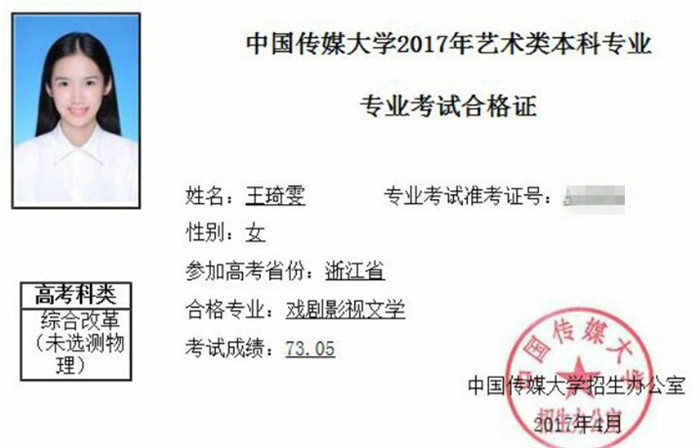 印象共拿到19张中国传媒大学合格证。其中播音与主持艺术专业,浙江省学生拿到合格证共16张,其中印象8张,占浙江省50%!包揽冠亚军!