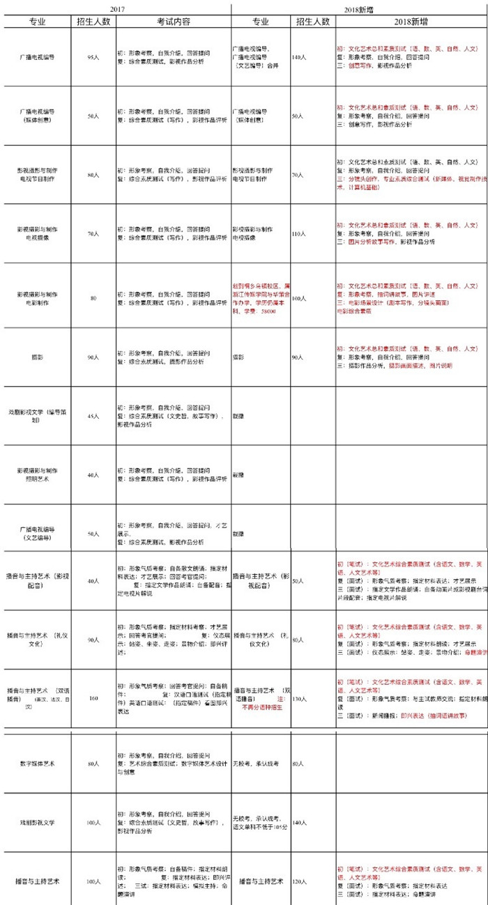 电视节目制作专业增加了分镜头绘画(绘图工具自备)。录音艺术增加了声音设计考核。电影摄影与制作增加电影场景设计(根据命题进行分镜头剧本写作或绘画)。