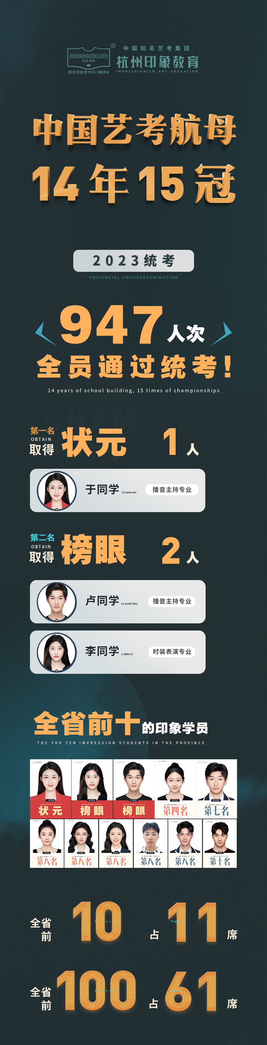 无论是明星顶尖成绩的个体学员,还是学员总量在高名次的比例或是通过率,无论是状元与前三甲,还是前100,无论是播音专业的稳坐霸主,还是编摄、表演等传统校考优势专业在统考层面的齐头并进,依然昭示了印象在传媒类统考占据无法撼动的地位。偶尔取得一些好名次可能是运气,十四年来从未失手,那就是“中国知名艺考教育集团”的实力!