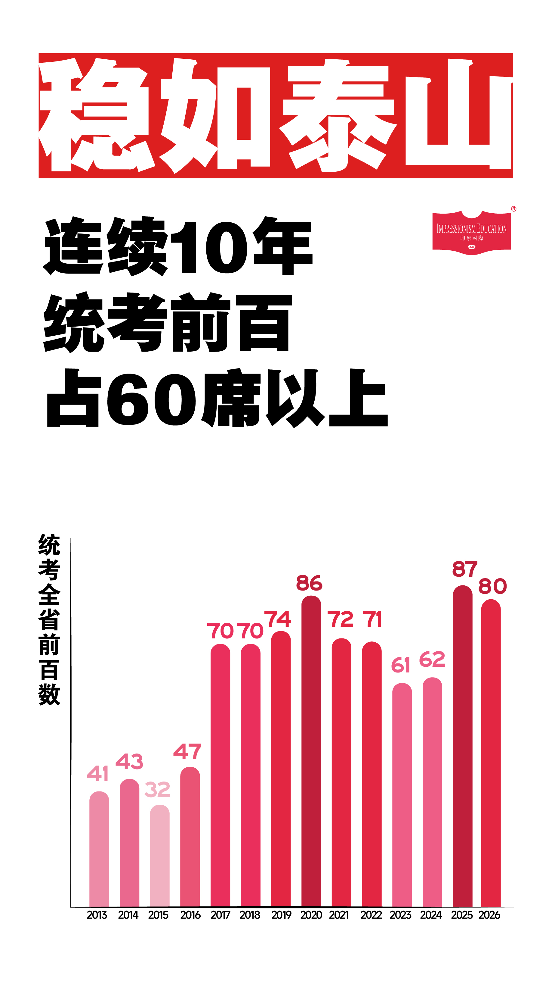 连续10年印象教育在全国多省的统考百强榜上,累计席位均稳超60席。截至发稿,印象学员已斩获80席统考前100,其中前二十占13席。