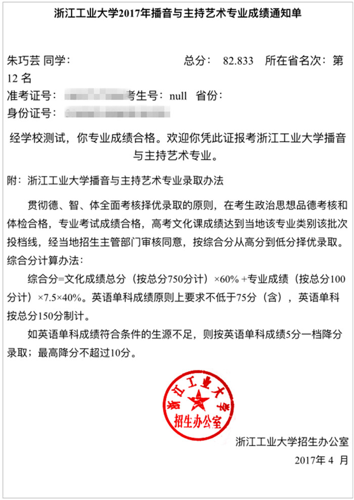 浙江省统考播音主持全省第七名